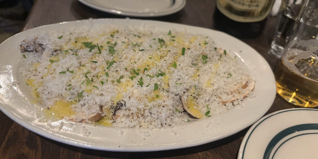 薄くスライスされたマッシュルームに、ふわっとパルメザンチーズがかかっていて、軽やかな口当たりが心地よく、印象に残る一品でした。